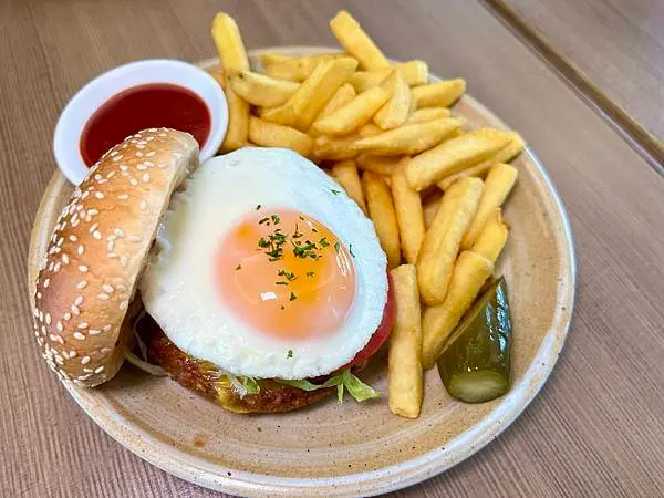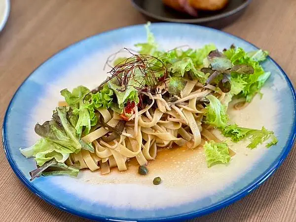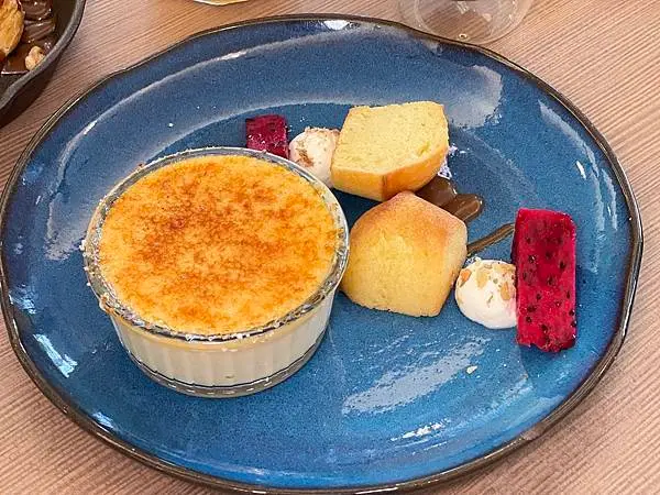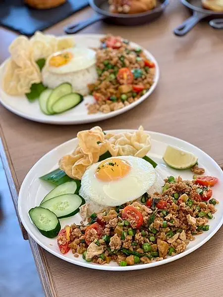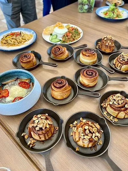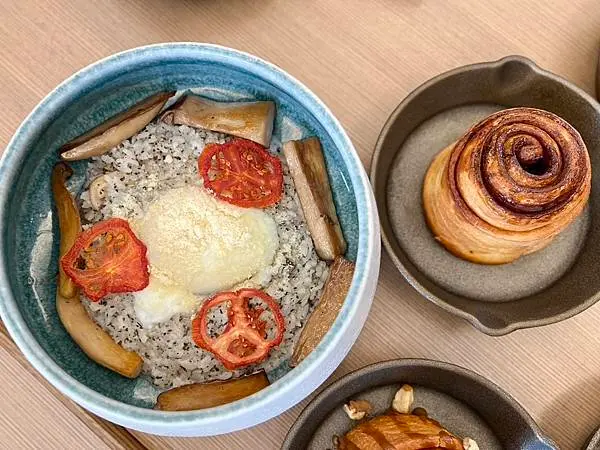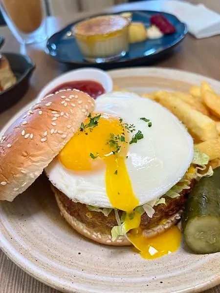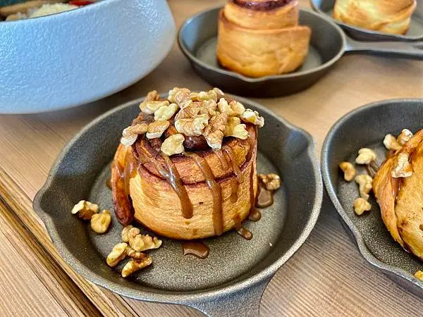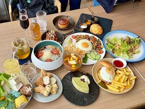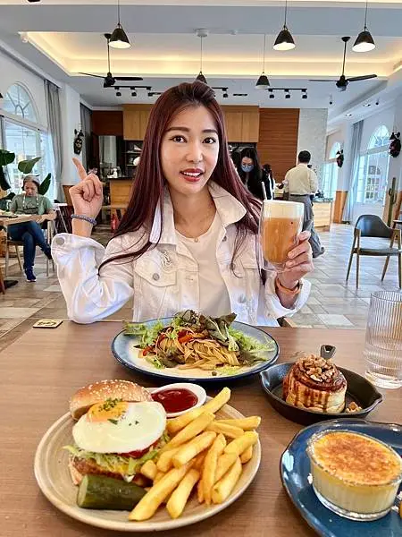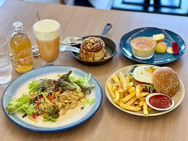 蒜香剝皮辣椒義大利麵 招牌起司手作植物肉漢堡 核桃太妃肉桂卷 法式烤布蕾 康普茶 泰式奶茶