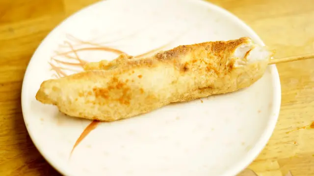 烤物的部分除了大腸香腸還有旗魚黑輪跟甜不辣,因為今天一來就失控點了一堆所以只點上旗魚黑輪。花時間細心烤製的旗魚黑輪,外皮真的達到類餅皮或是硬麵包的那種酥脆感。裡面的魚漿柔軟Q黏,加上中間的蛋香。喜歡烤黑輪的人要試試,但是不要衝動點太多支因為這裡的尺寸是XL而且攤上還有許多選擇不能放過。