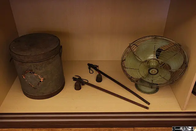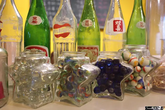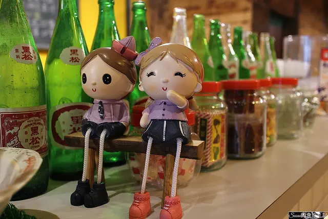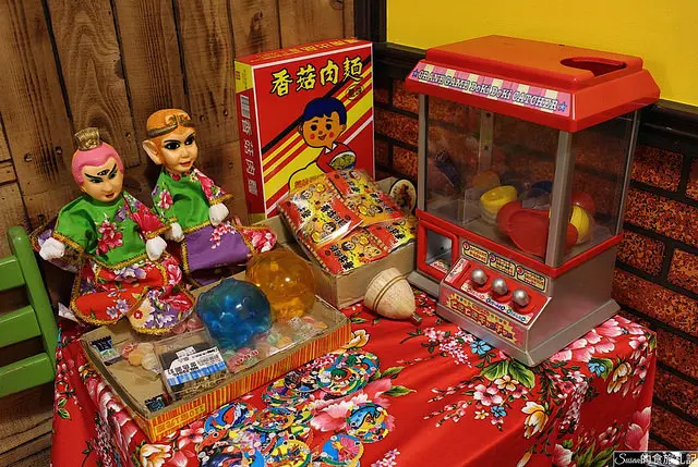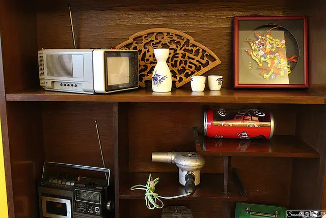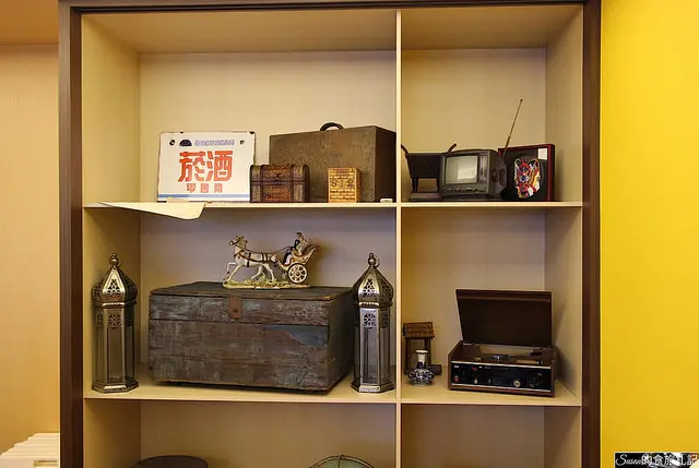 二樓的窗框裡擺放了好多懷舊的家電和小物