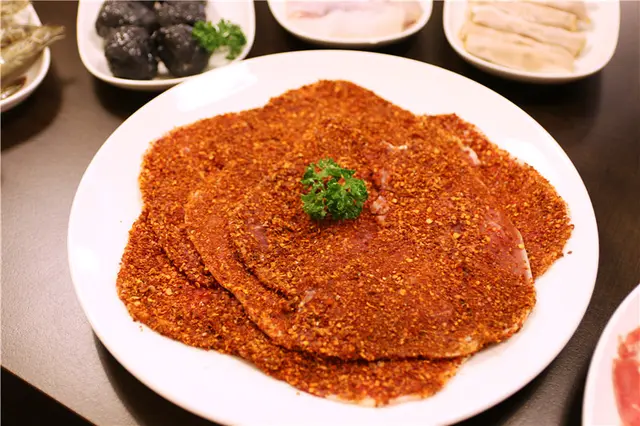 肉片上灑上大量各式不同的花椒及特製香料來提味