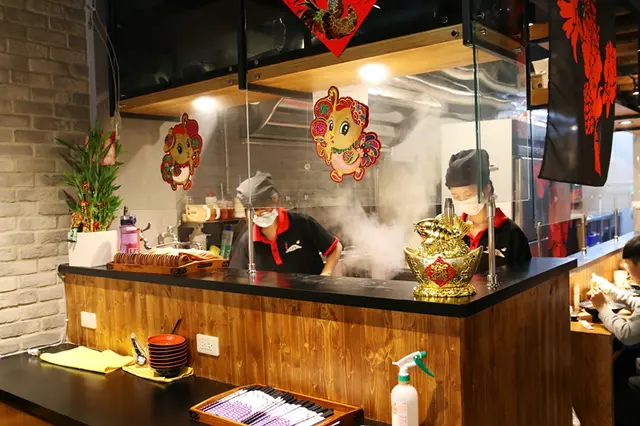 透過透明帷幕可以清楚看見師傅下麵.撈麵與製作叉燒的過程