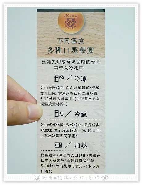 捎來書籤式字卡,店家傳授三種吃法,冷凍、冷藏、加熱的口感皆不同!