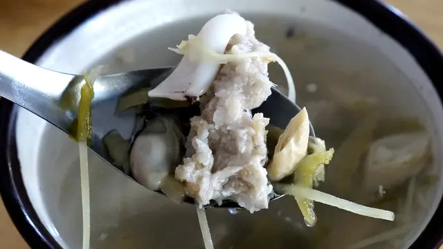 綜合湯裡面的料種類有蚵仔、虱目魚肉、花枝跟豬場。魚肉的部分不單只有魚肉還裹上魚漿。湯裡還加上了些薑絲及鹹菜,與高湯一起堆疊出鮮味。