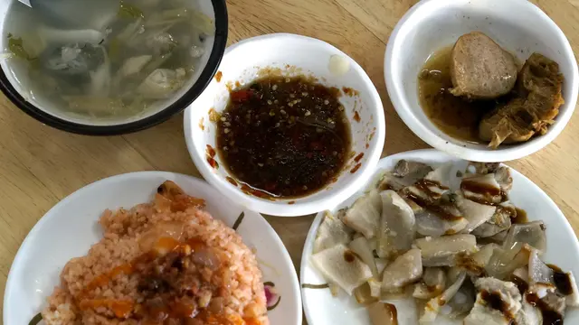 這裡的招牌當然就是店名上的紅飯了,飯煮好後會用以蕃茄醬為基底炒製的紅醬下去拌勻就成了紅飯。上桌前還會淋上特殊的澆頭,有肉燥、洋蔥、還有切細的小筍丁。攪拌後一起入口不會只嚐到蕃茄醬的味道,還有肉跟洋蔥的香味。筍子還讓紅飯多了一個鮮脆的口感。