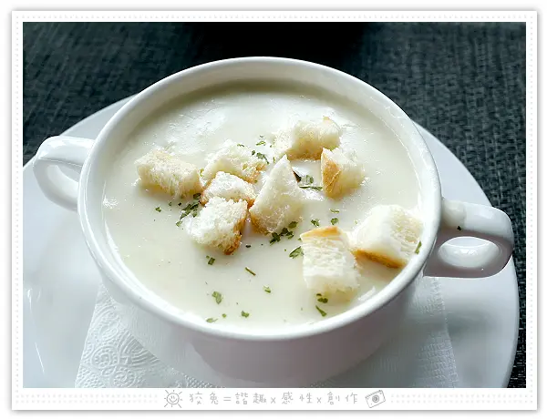豪邁裝到九分滿,輔以麵包丁,調味鹹大於甜,是隸屬濃重掛的!