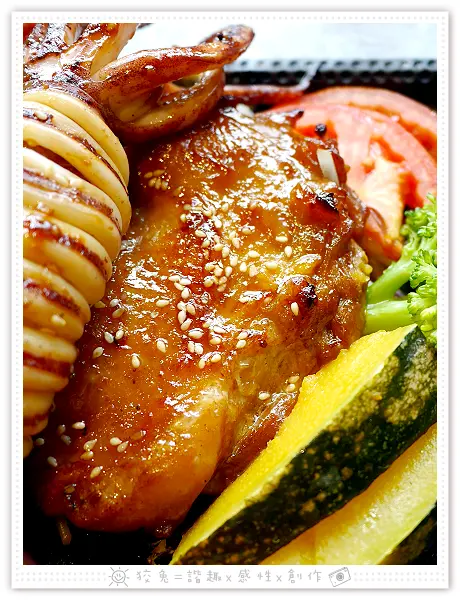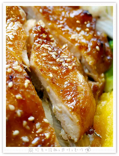 外觀超犯規的醬烤雞腿排,閃閃動人,無疑是盤中的最大亮點!