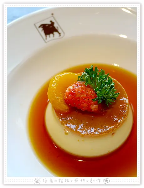 布丁綴以草莓和橘子,蛋香濃厚、質地紮實,吃完超有飽足感!