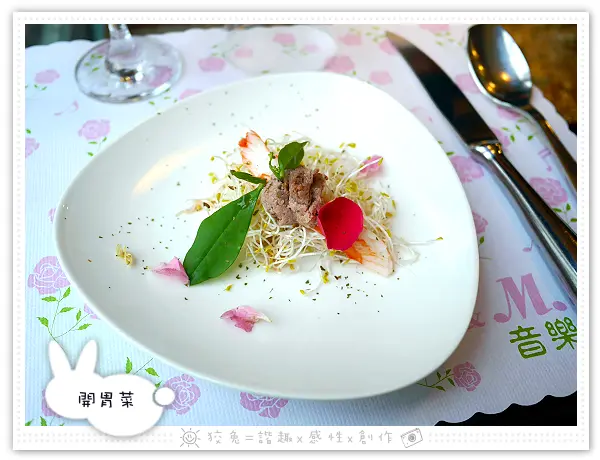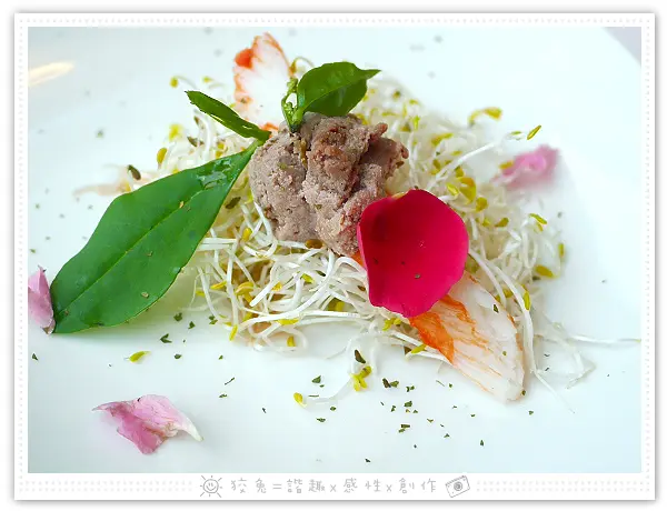 一嚐不出我所料,略帶腥味的鵝肝醬,佐以苜蓿芽和蟹味棒~~