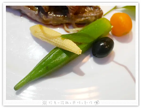 白盤上擺著秋葵、玉米筍、橄欖和紅蘿蔔球,幾乎要湊滿五行的顏色!
