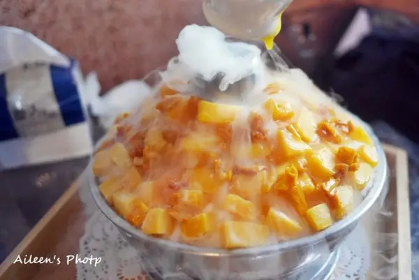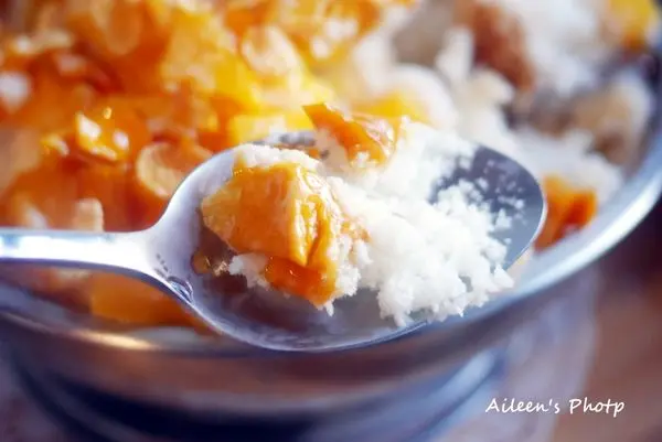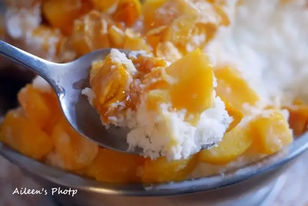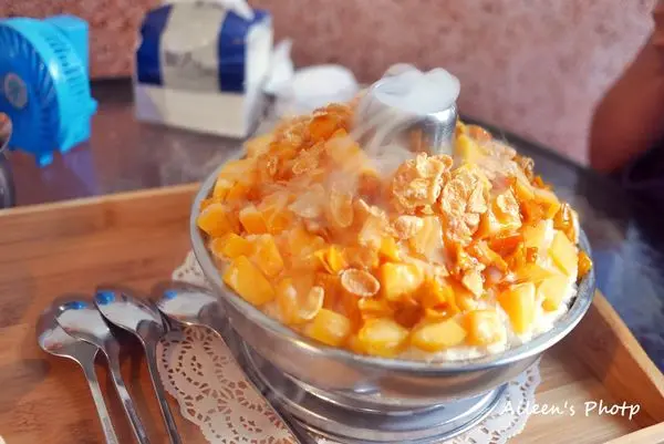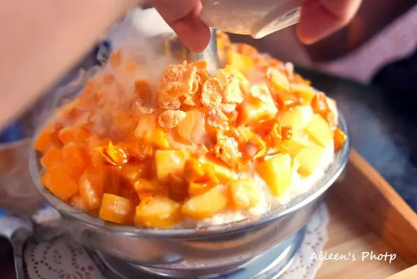 用新鮮芒果搭上芒果乾和玉米片,再加上甜甜的雪花冰,吃起來酸甜可口。