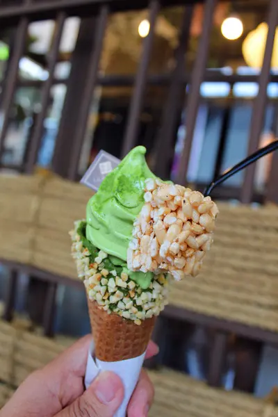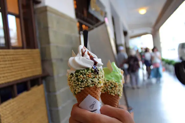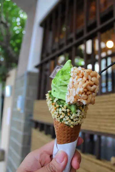 在這炎炎夏日 大家等著排隊進場的同時 如果可以一邊吃冰一邊等待 想必是一件很幸福的事情吧 他們這家冰淇淋專賣店呢 剛好就位於入口旁邊 對外也有窗口可以直接購買冰淇淋 最重要的是 店員可是穿著和服的可愛正妹
