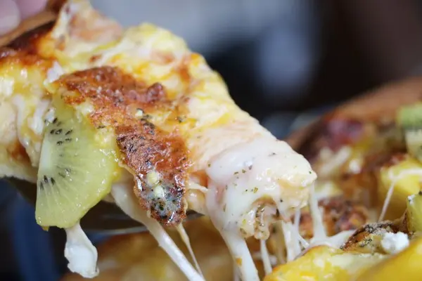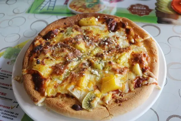 上面滿滿的水果,有奇異果、芒果與蘋果,老闆說有時候會依季節不同做調整還會有鳳梨。上面再加上濃郁的起司以及白色乳酪,讓披薩濃郁度大增,口感更為豐富。