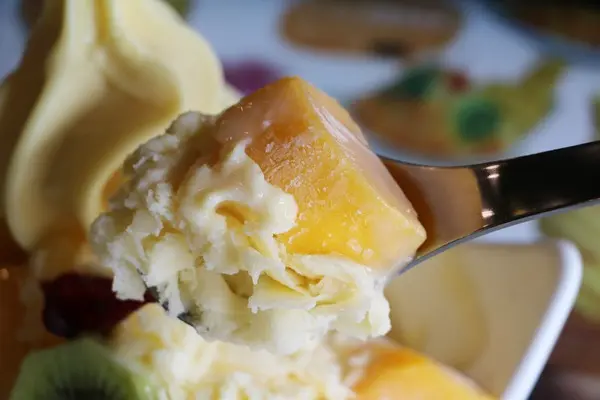 附送的甜點是手工鮮奶酪,這是芒果口味。另外還有單點販售,口味有芒果、奇異果、鳳梨、巧克力與煉乳,單點一份$50。