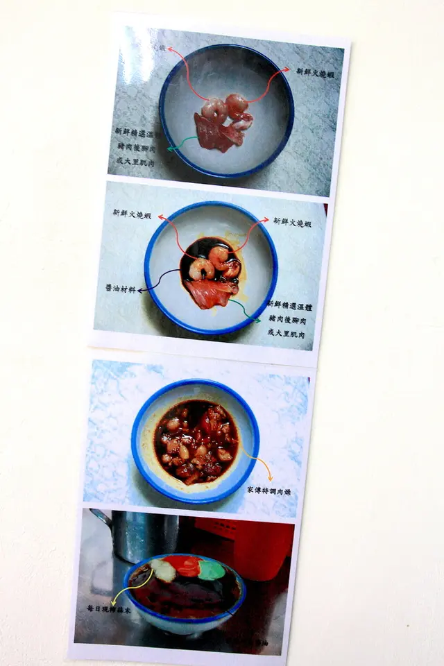 牆面上貼著一味品的碗粿的製作過程,裡面有使用溫體豬肉、火燒蝦與肉燥等等。