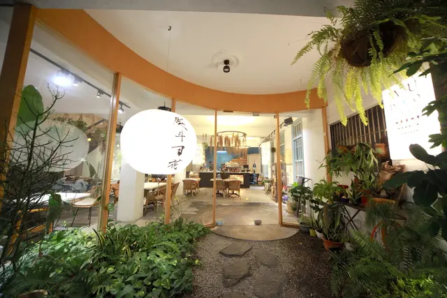 磨石子的外觀與雕花陽台是老宅亮點, 透天老宅在燈光襯托下更顯柔情氛圍。整面透明玻璃可以直接看到裡面情景。大門口鋪上小碎石再搭配綠色植栽,充滿日式庭院悠閒的氣息很舒服。潔白大大燈籠上頭寫上「熨斗目花」字體。