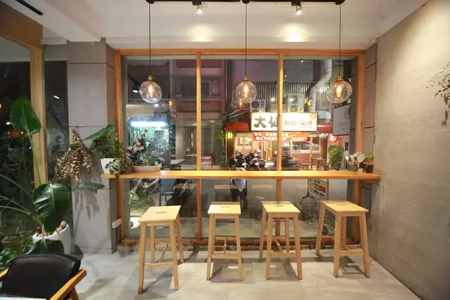 原木高腳椅可以觀賞老街是慵懶座位。