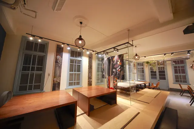 眼前是墊高很有質感的榻榻米坐位,上面擺上深色的矮桌令人心情愉悅,眼前的日式榻榻米呈現展覽空間,很適合家庭與公司聚餐使用。另一個亮點就是放在玻璃隔牆中間深色的『大振袖』。