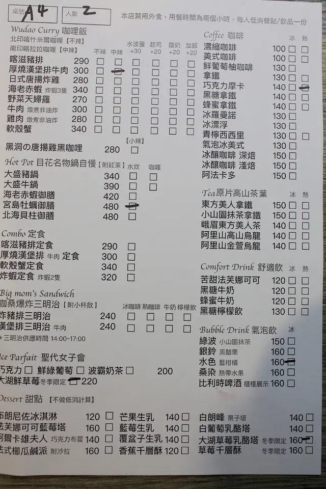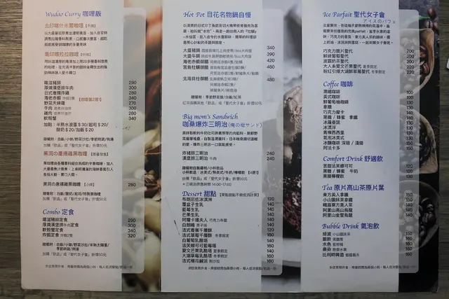 這張是店家的菜單供客人點餐參考,這裡菜色主要有咖喱飯、定食、鍋物、三明治、甜點、冰淇淋與各種飲料等等。