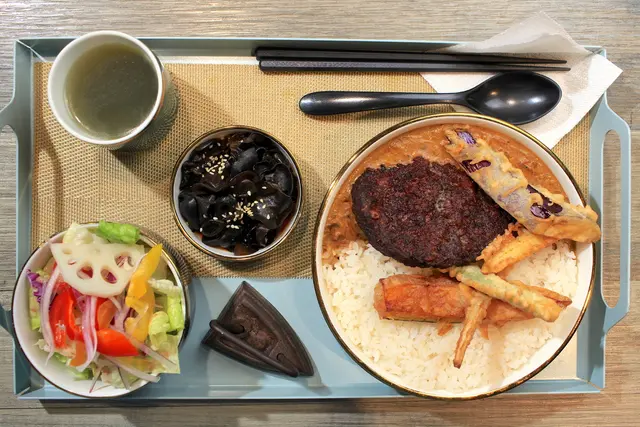 這套餐裡面有主菜有漢堡排牛肉咖喱飯、生菜沙拉、黑木耳及熱湯等等。使用黑色很有質感瓷碗來裝盛,裡面生菜品項很多淋上胡麻醬汁。海帶熱湯很爽口好喝