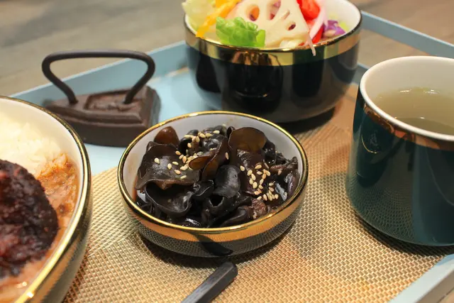 涼拌黑木耳淋上醬汁灑上白芝麻,黑木耳鹹度適中脆口好吃。