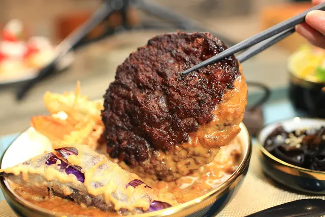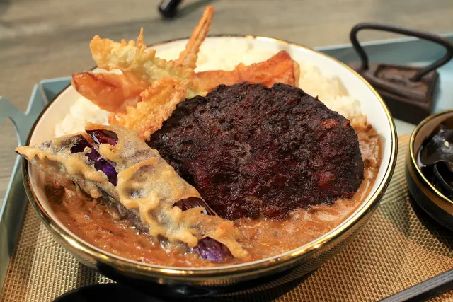 這漢堡排牛肉咖喱飯份量很多,裡面有厚實大片牛肉漢堡、天婦羅及滿滿白飯。