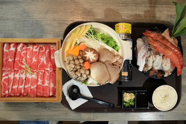 這是宮島牡蠣御膳480元與豬肉盤250元,冬天到選擇品嚐暖呼呼火鍋最享受。
