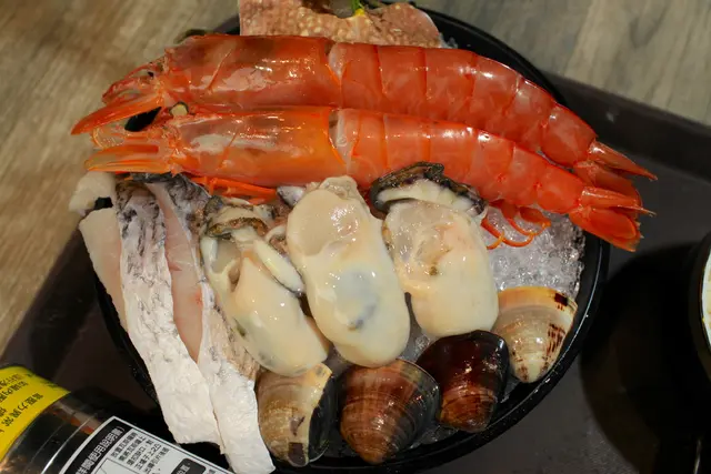 各種生猛海鮮底下鋪上啐冰來保鮮,海鮮有宮島的牡蠣、天使紅蝦、蛤蜊及鱸魚等等。這高湯與蔬菜熬主後更為鮮甜好喝。