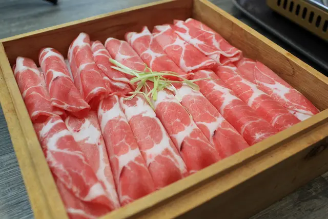 豬肉盤250元使用木盤來裝盛,豬肉片油花分布很美觀份量很多。豬肉片煮熟後很軟Q不柴超級好吃。