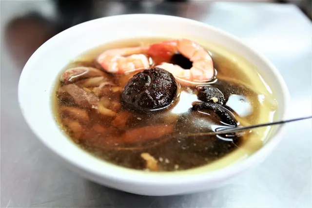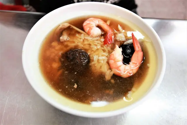 香菇飯湯裡面有瘦肉條、整顆香菇、筍絲、鮮蝦等食材,把白飯放入再淋上香菇高湯就完成。