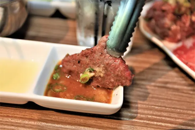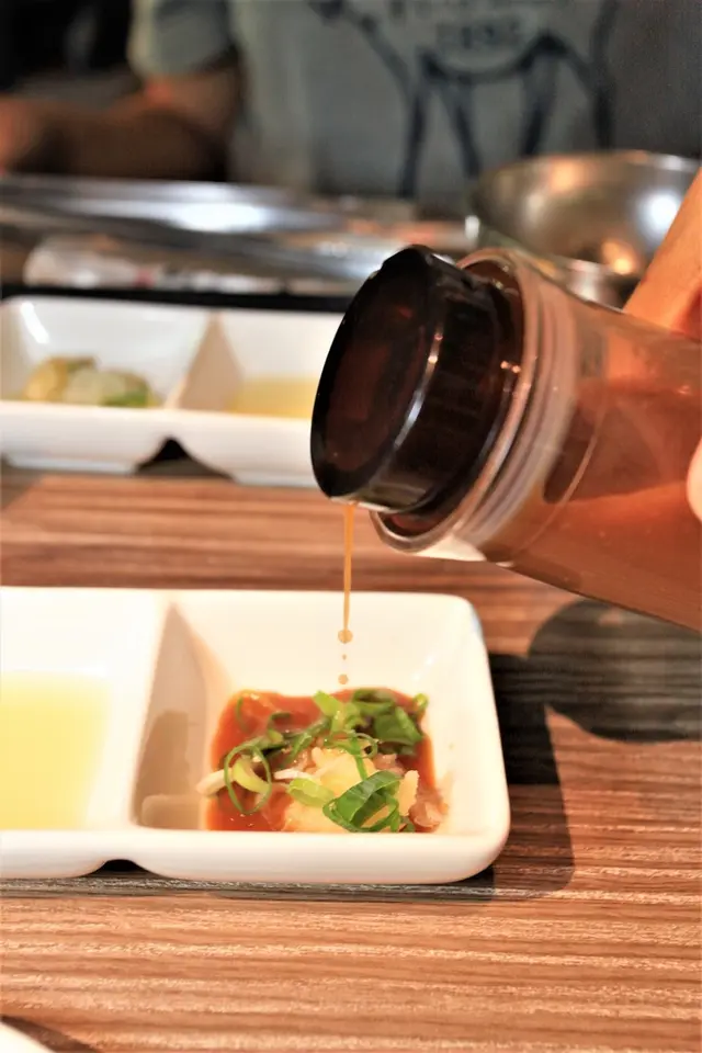 桌上每人皆會有三種腥香料有蔥花、蒜泥與洋蔥末,中間上方的小方碟內的有檸檬汁,旁邊兩瓶是烤肉醬汁與味噌醬汁做為沾醬。