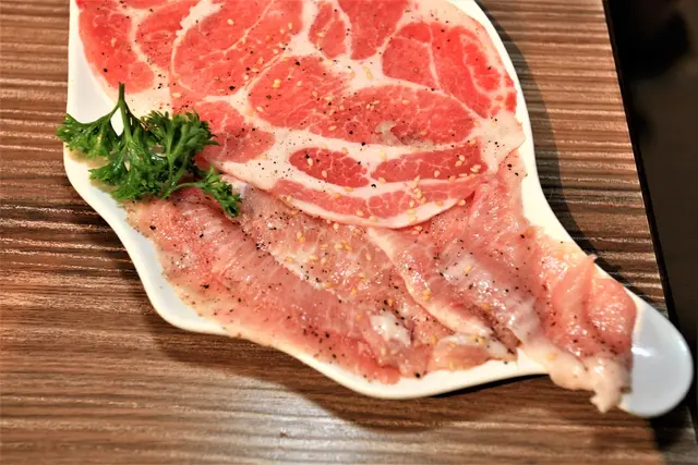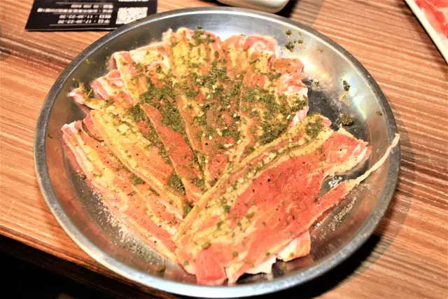 這是豬五花有事先醃漬過再灑上胡椒鹽與白芝麻。