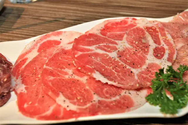 這是霜降豬肉似乎都有事先醃漬過再灑上胡椒鹽與白芝麻。