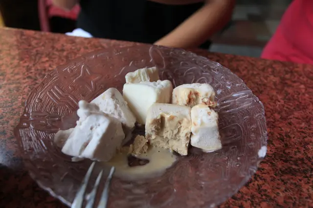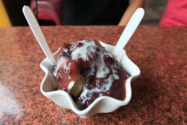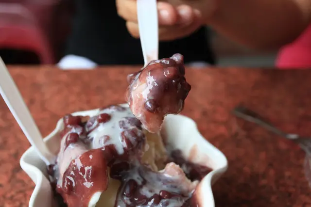 是使用牛奶打發急凍製成的上面淋上紅豆,濃濃牛奶香搭上紅豆很對味不錯吃。