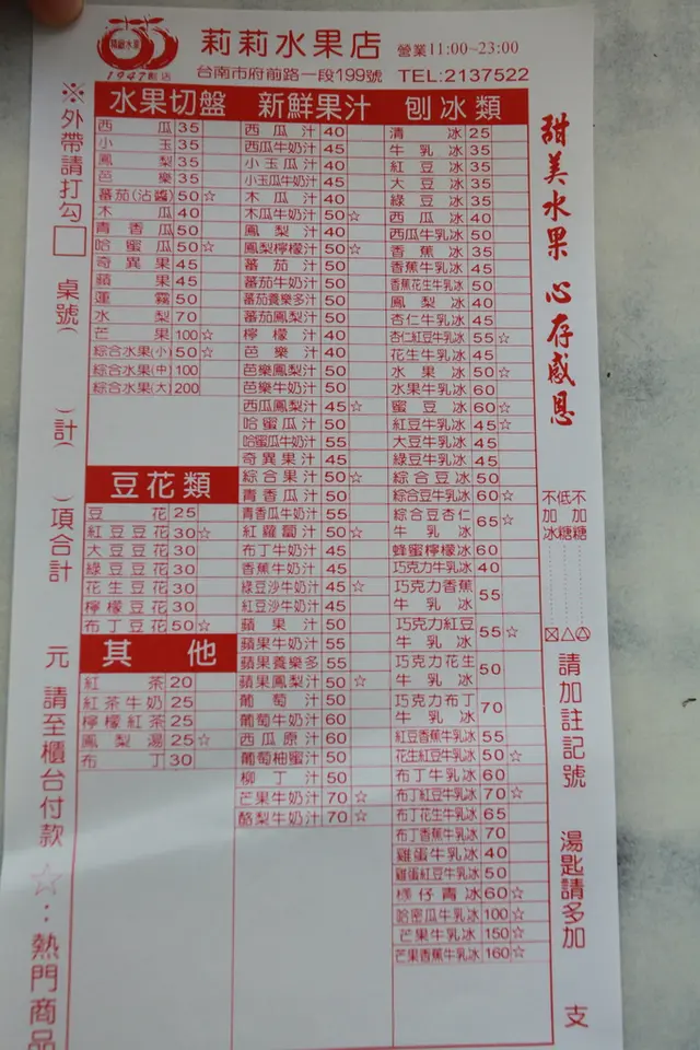 Menu新鮮水果、果汁與冰品等等價格偏高,勾完菜單先去櫃檯先結完帳。