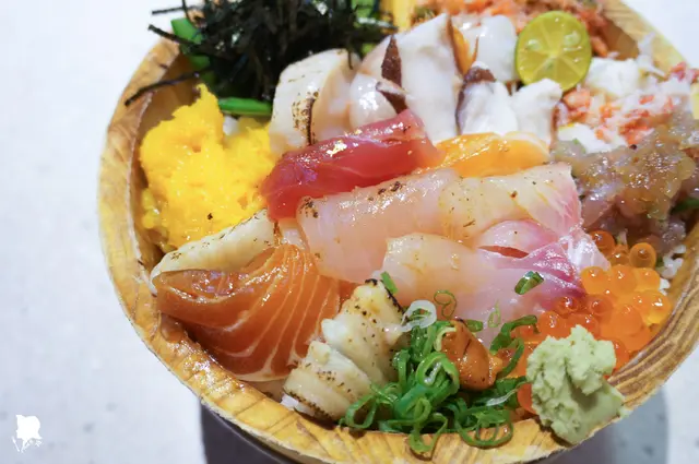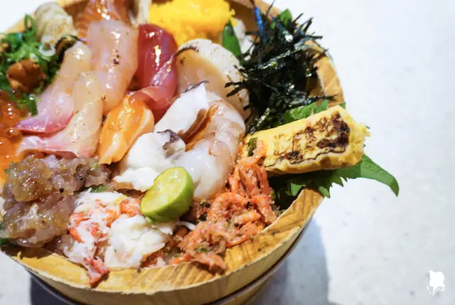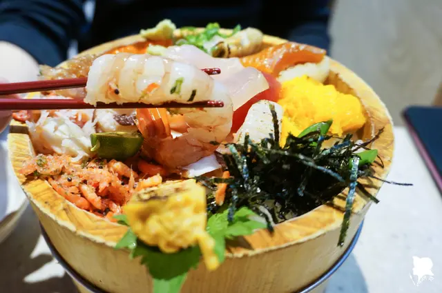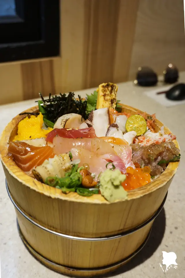 用木桶盛裝由十六種食材組合的毛丼,不論從哪個角度看上去,