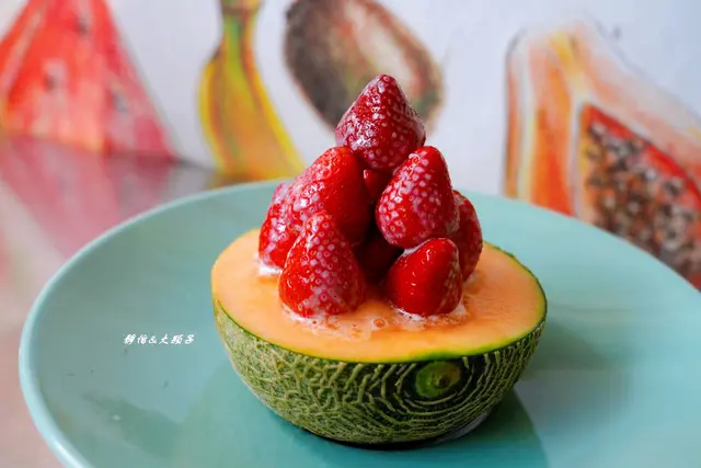 整整半顆哈密瓜加上好幾顆新鮮草莓,大概10顆草莓左右吧