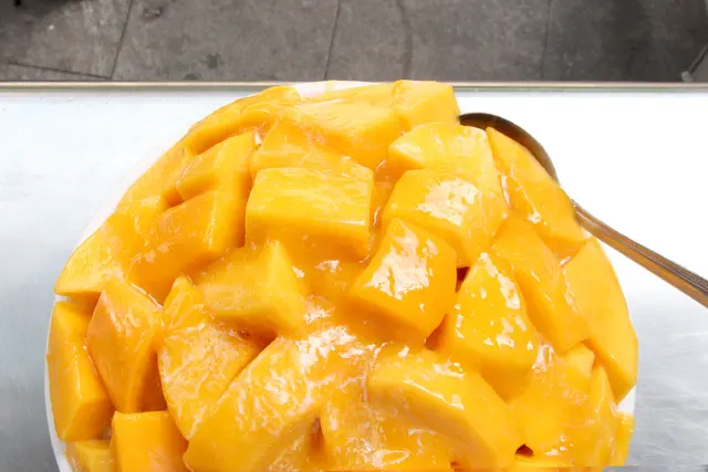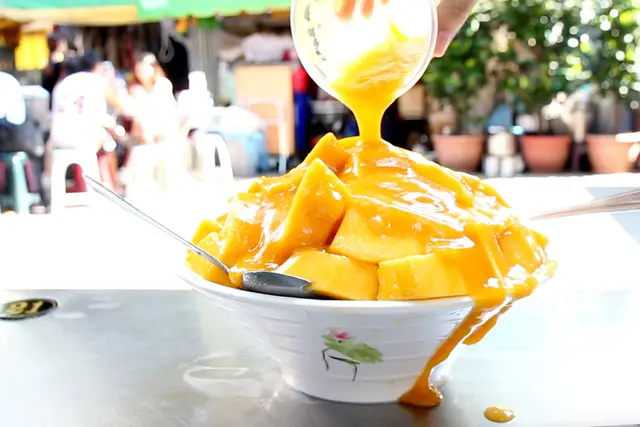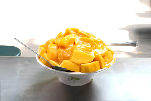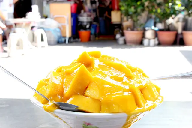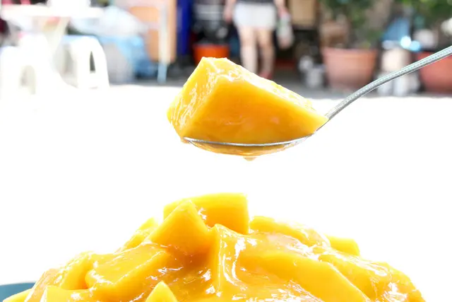 一碗芒果牛乳刨冰上,不只有推疊像山的現切芒果,