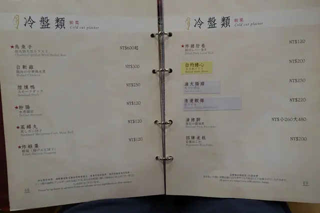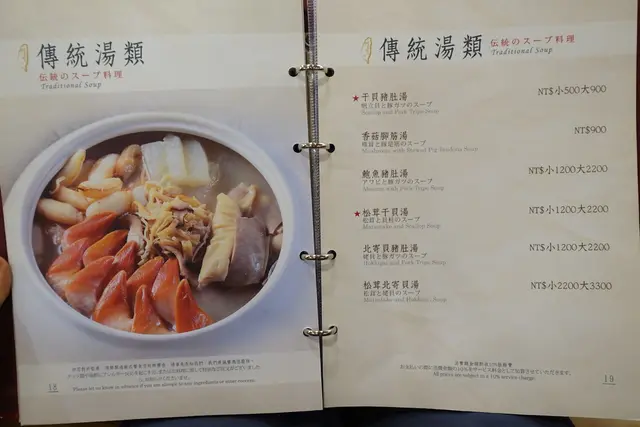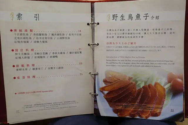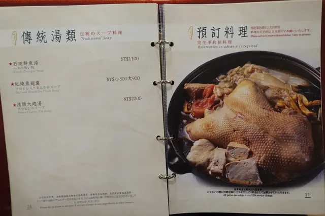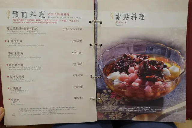 這一頁的預定料理,就讓人想到總鋪師中的水腳A、B為了做出雞仔豬肚鱉,在那邊用筆刀去雞骨,為了把鱉放進去雞肚子裡,不知道試了幾次,最後露絲米竟然是把鱉切塊放進去,大家看了都傻眼啊,如果想實際吃吃看讓總鋪師片中大家這麼煩惱的雞仔豬肚鱉,記得要在三天前預訂,還有為了環保就不要吃魚翅喔!
