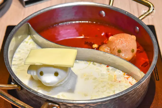 札幌熊起司牛奶湯的白色熊熊底下還有兩片起司,激辛麻辣湯則是額外提供乾辣椒,吃比較辣的朋友可以多加一點辣椒來熬煮,激辛麻辣湯有著淡淡的花椒香,辣度剛剛好,不會過於刺激或是直接辣喉嚨。