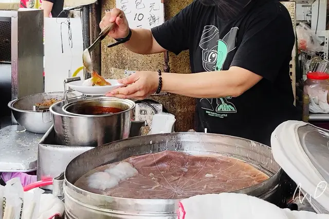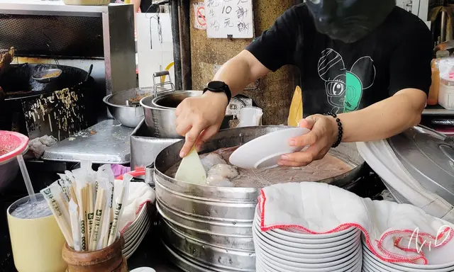 老闆用飯匙鏟起肉圓,放到盤子內