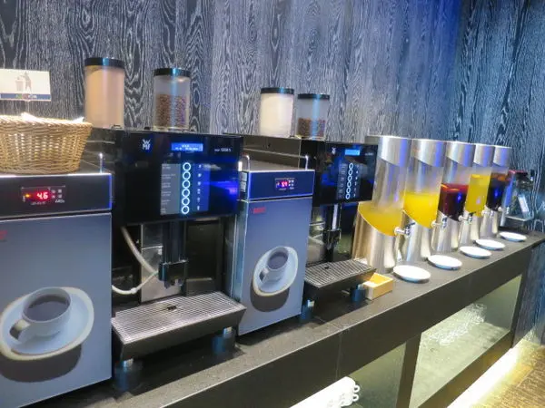 [飲料區] 各種早餐會出現的飲料都有 果汁 咖啡 一旁還有各種牛奶 豆漿