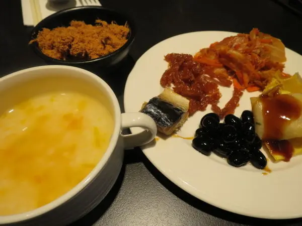清粥小菜 有地瓜粥 黑豆 蛋餅 肉鬆 還夾了一點泡菜 讚