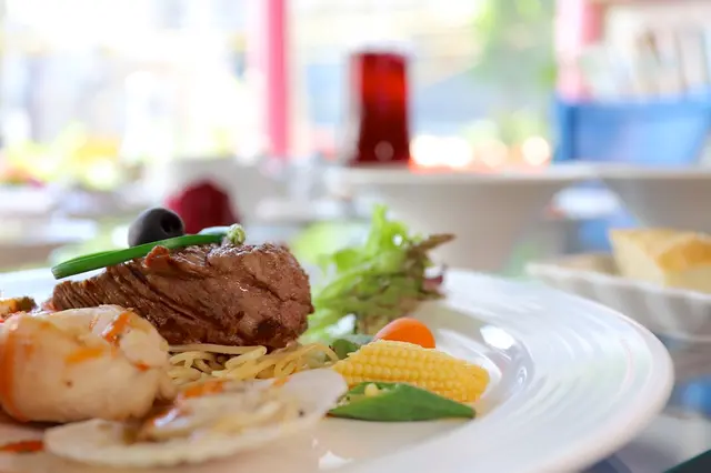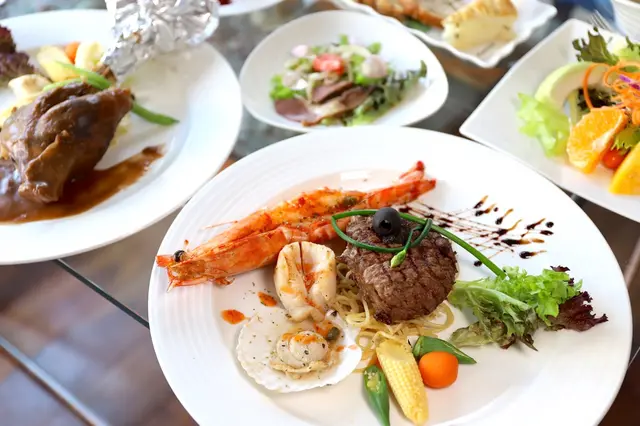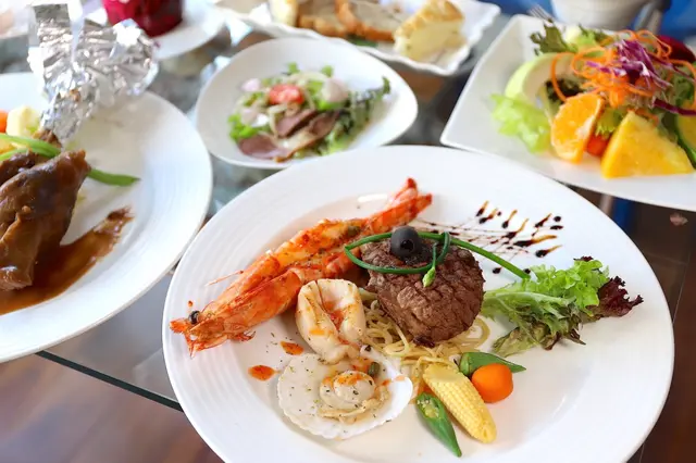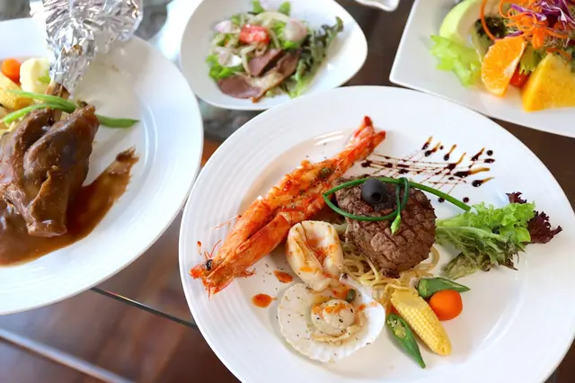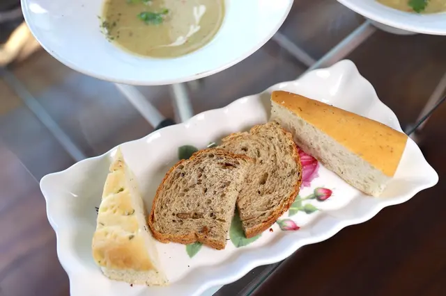 除了主餐外,另附:開胃醋、開胃菜、沙拉、手工麵包、法式濃湯、甜點、飲品。(今日搭配的開胃菜/濃湯:櫻桃鴨胸肉開胃菜、鮮菇地瓜時蔬百匯濃湯)