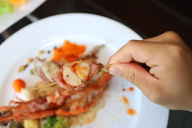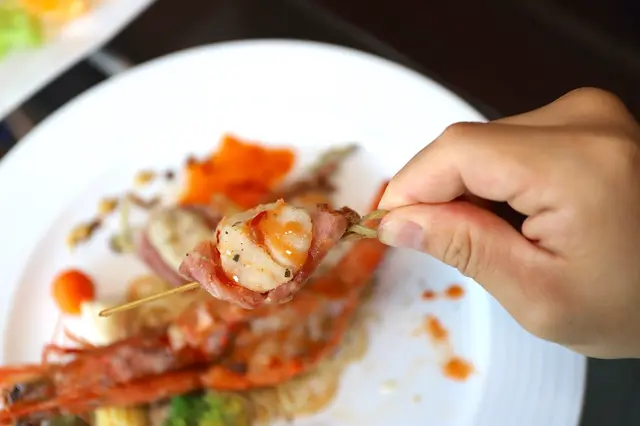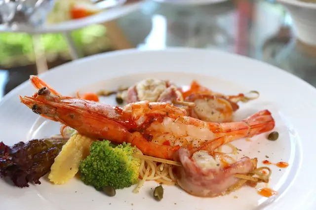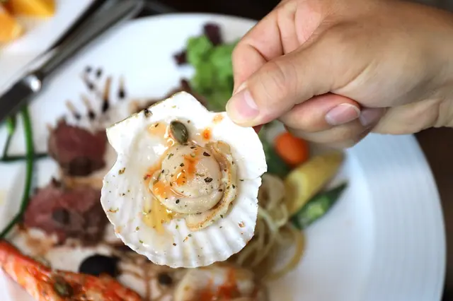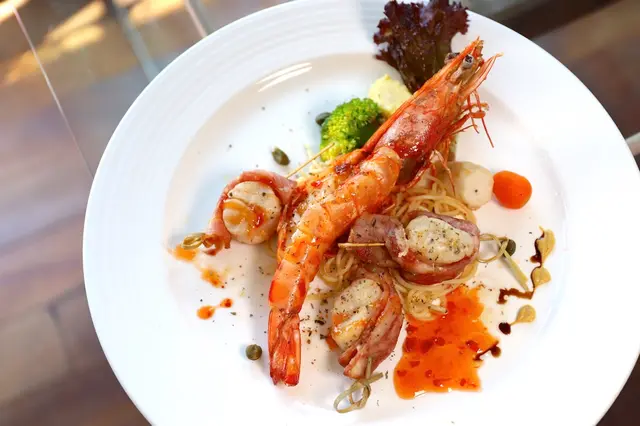 也是一大尾明蝦;另外有三大顆日本干貝,還用培根包裹起來,看起來更加可口。