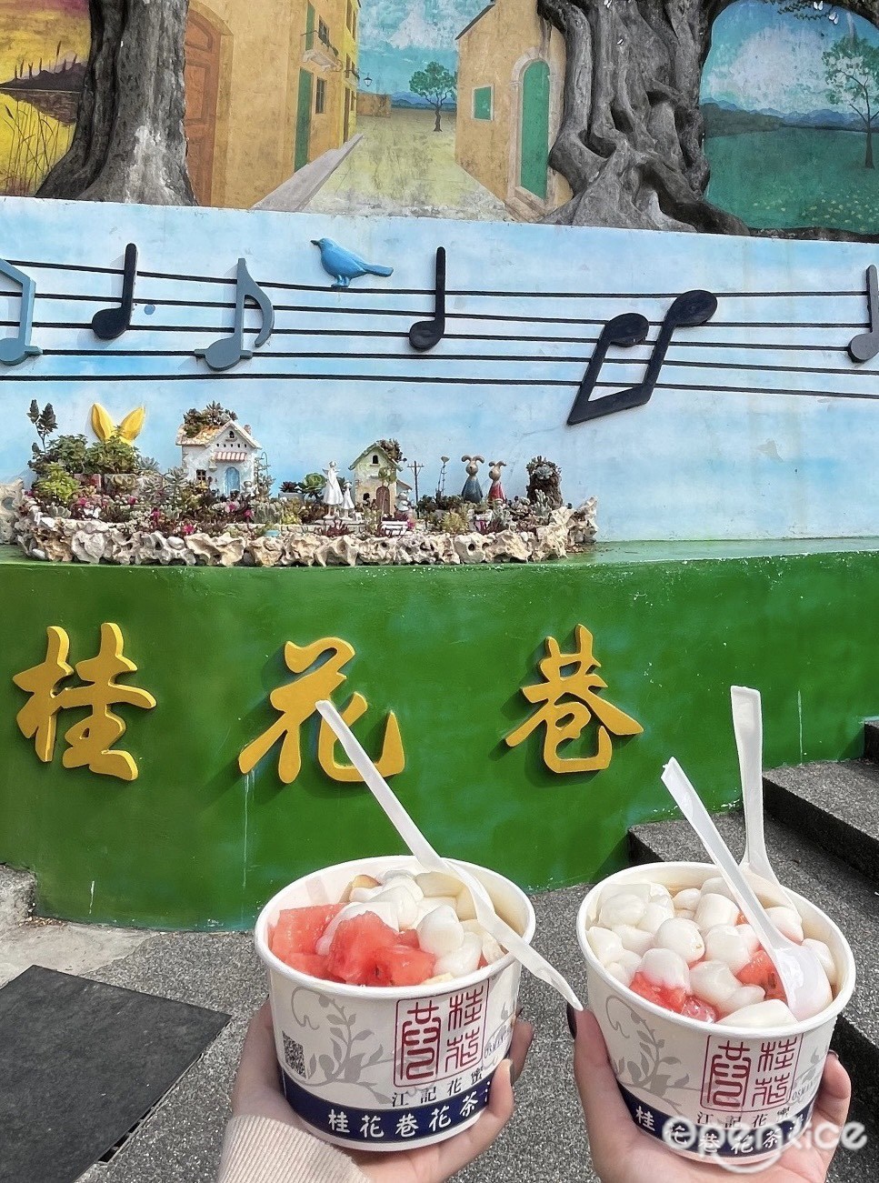 位於南庄老街裡的「江記花蜜」,初始為販賣桂花釀起家,他們家的桂花釀濃稠、桂花香氣十足,招牌桂花釀湯圓冰配料豐富,除了軟Q的湯圓外,上頭還有許多季節水果,搭配著甜蜜的桂花釀,吃起來清爽不甜膩,一口接一口一下就吃完了!