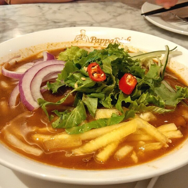 PappaRich集團成立於2005年,第一家店坐落在馬來西亞吉隆坡。十年間已在馬來西亞成長到70多家店,海外也有30多家分店,在當地與國際餐飲業界是知名的新興品牌。全球分佈106家, 2015年進駐台灣 (取自官網介紹)金爸爸也是在朋友的推薦之下去吃的~他們吃過一次之後還是念念不忘又再訪!第一次我是在聖誕夜去吃,第二次是平日晚上,不過都不用訂位就可以立即入座就是了金爸爸就在市民大道上,從忠孝敦化七號出口出來後走個五分多鐘就到了~距離逛街的區域也很近,加上營業時間很長,個人覺得很適合在逛街後當作晚餐或消夜的選擇一走到店門口可以看到不愧是國際連鎖餐廳,店面很寬敞和明亮,也會有店員帶位裡面座位數很多~聚餐也是不錯的選擇,雖然有一成服務費,但是整體來說服務還不錯,服務人員態度很好!入桌後就可以拿到菜單點餐要自己點單子,只要寫編號就好,事後服務人員會再確認一次餐點種類蠻多樣化,有飯有麵也有甜點等等,很難抉擇啊!!一般的飯麵大約落在兩百~三百左右,比較特殊的菜色可能接近四百,如果是海鮮的話又再高價一點,但個人覺得這樣的價位在東區還算很能接受了XDD (還是我標準太低?哈哈哈)爸爸咖哩叻沙菜單介紹上寫被評為一生必嘗的十大美食之一,也是列在推薦菜色上雖然去了兩次同行的不同友人都點了這道,但我還是不知道究竟嘗起來的味道是?不過朋友說這道吃起來會辣就是~~~辣椒蟹炒飯這個我很喜歡!雖然說有辣椒,可是我覺得不至於多辣,就提味居多吧哈哈醬汁吃起來甜甜鹹鹹非常下飯!完全是小孩子口味的人會喜歡的小小缺點是炒飯有三色蔬菜,不過這點不影響它的美味程度,飯炒得也算粒粒分明了椰漿飯+咖哩雞腿其實端上來的時候有點失望,因為看起來很空虛,就是雞腿飯啊哈哈哈哈哈哈哈幸好它是好吃的啦~椰漿飯聞起來真的很有椰漿味,口感偏軟糯但不會軟爛,酥炸的小魚跟飯一起吃很配!雞腿部分表現的中規中矩,夠軟也算入味爸爸海南蒸麵包 +牛油與加央這是我此生第一次吃到加央!加央是指椰漿、鴨蛋、雞蛋、砂糖和牛油等材料製成的甜點醬料(維基說的)吃起來就甜甜的這樣麵包熱熱吃很軟好吃,味道很容易想像哈哈哈,不過老實說比起加央醬個人還是覺得直接抹奶油更好吃爸爸特式寶貝冰+雪糕這個很微妙,一生中嘗鮮一次就夠了上面的冰淇淋不錯吃,其次是刨冰本體,因為有加椰糖吃起來甜甜的玉米的部分很像玉米湯,綠色的是斑蘭葉製成的粉條,吃起來脆脆的透明的塊狀物是一種水果,但我忘了XDDDDDD這起來口感很神奇很像人工製品但它是水果!!!!爸爸豆漿湯圓+馬六甲椰糖芝麻湯圓加上豆漿~很特別的組合!但搭配起來非常協調!好吃~以上簡單紀錄~…查看更多