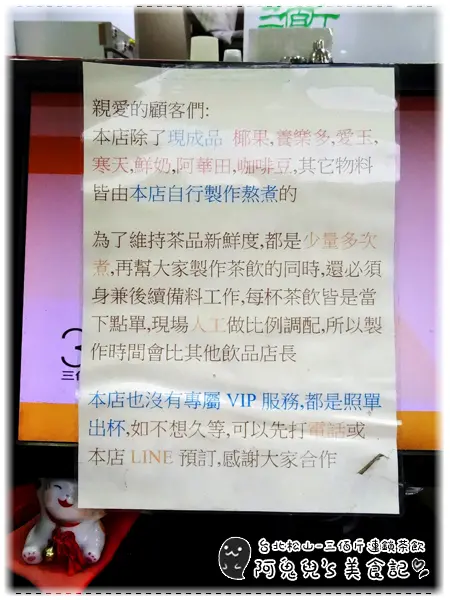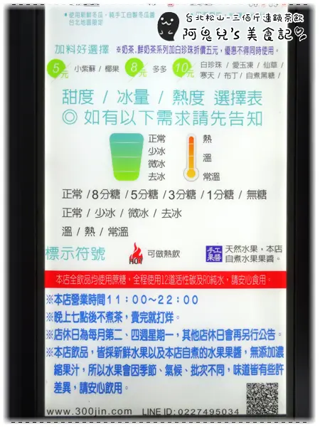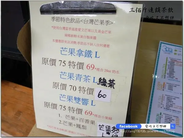 我超愛喝飲料的,不管冬天、夏天,來一杯好喝的飲料,總能替辛苦工作的我來打打氣!發現他們家跟別的飲料店不同,居然連果醬都是自已熬煮的耶!這麼費工用費時的製作方式,讓我一喝就愛上這迷人的好味道!三佰斤連鎖茶飲在北部只有一家加盟店,在中南部比較多家。飲料種類超多,每一種都很有特色,比起市面上別的品牌的飲品店,我個人覺得來到這家,會讓我有種每一杯都想喝喝看的衝動!如果不知道要喝什麼,可以請服務人員介紹哦,店員對於自已的飲料很有信心,在服務上也很親切,你可以將想要喝的味道告知店員,他們就會幫你調配出一杯最好喝的飲品!店內環境乾乾淨淨,桌上小招牌標示出季節飲品一旁還有仙草甘茶的布條外送滿300元以上就有95折的優惠,可惜我不住這,不然就會吆喝同事一起買!這次取回六種飲品,每一種我覺得都好耐喝哦!像這款芒果拿鐵,雖然單價稍高了些,不過裡頭的芒果醬可是店家用二種不同的芒果熬製而成,在味道上很有層次,搭配鮮奶一起調配,完全不需要額外加糖,就非常的有味道,奶香及芒果的香甜,怎麼喝怎麼對味!黃色的那杯金桔檸檬女孩們應該都很喜歡,酸酸甜甜的喝起來好清爽,喝完後那味道還會留在口中,很清香!這杯桑椹奶茶搖晃後顏色會綜合在一起變成夢幻的紫色,裡頭的桑椹醬也是自已熬的,很妙的是還可以吃到整顆的桑椹果實,喝起來有桑椹的香氣還有一點酸甜味,跟奶味一樣很合,我還是第一次喝到這麼真材實料的好味道,這杯大推!喜歡喝茶的朋友們可以試試這杯冬瓜烏龍,裡頭的冬瓜醬一樣是自已熬煮的,喝起來有冬瓜甜味及茶香,很妙的味道百香雙響裡頭有滿滿的料,不用說,就連百香果醬也是自已來,完全就是一杯手作的真材實料!裡頭滿滿的,喝起來香氣十足還很有飽足感!鳳梨青茶底下的鳳梨醬當然也是自已來,總之這家店的所有果醬都是自已熬煮而成,現在很少看到這麼費工、費時的製作果醬,新鮮的喝起來就是不一樣,裡頭的鳳梨乾並不會乾澀,好像是在吃整顆鳳梨一樣的口感!喝完一輪後真心覺得要喝飲料就該選擇這種比較沒有化學成份的飲品來喝,你也跟我一樣喜歡喝現搖的飲品嗎?…查看更多