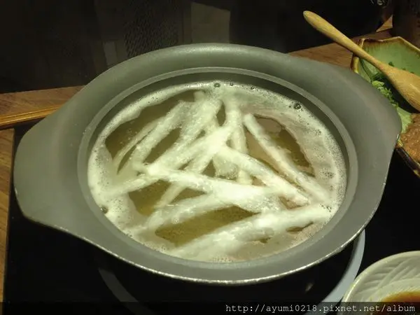 黑毛屋主打日式鍋物,搭配的酒類自然是以清酒為主,也有提供少量紅、白酒、啤酒等。內側為半開放廚房,可望見鈴木總料理長指示著廚師們備料。 鈴木總料理長比我想像的年輕~笑起來好溫暖。參觀完畢,我們先行入座,準備一享美食。黑毛屋使用大地色系的陶瓷鍋具、餐具等,呈現一致整體性。火鍋的火候掌控很重要,該店使用的爐具功能強大,除一般常見的定溫、加熱功能外,還能顯示目前溫度。橙醋醬這道醬料的酸味較重,搭配蘿蔔泥及蔥花,微酸爽口,主要是用來搭配蔬菜類。黑毛屋另一特點為其一對一式的「仲居服務」,服務人員態度皆具親切專業,讓我們有賓至如歸的極佳感受。當天也有美女正妹服務生為我們服務~這是男性的福利啊!!!其中馬尾正妹服務生小艾,照片上傳更是迷倒了一票網友,紛紛吵著也要到黑毛屋吃火鍋看正妹了XD(上次去吃牛排也是…後來跟女性友人一起相揪再去吃牛排,可惜帥哥主廚不在Q_Q)前菜-北海道組合特別選用北海道名產,正當時啊~照片由左至右為煙燻鮭魚、沖漬螢烏賊、奶油馬鈴薯 。建議食用次序為由淡至濃。煙燻鮭魚 淡橘帶紅的燻鮭魚,細緻柔軟,煙燻香氣及鹹味都恰到好處,沾些現磨芥末,辛香更能襯托出鮭魚的豐美油潤。奶油馬鈴薯原顆上桌,飽滿圓潤,從中切為四份,蒸熟後以奶油切片添香,可充份品嚐馬鈴薯的自然原味,考量客人口味,也有提供海鹽可自行調味,當天純粹品嚐原味,馬鈴薯的鬆、香、軟、甜,完美呈現,簡單的作法,突顯出食材本身的美味,愛吃馬鈴薯的朋友們一定要試試。沖漬螢烏賊之前曾在日本節目上看過,漁船將現撈烏賊直接放入船上醬油桶醃漬,保持其鮮度,這種作法稱為「沖漬」。螢烏賊小巧可愛,色澤深褐帶些微紫,通體完整而斑點鮮明,在燈光下閃閃發亮,鮮度絕佳,入口先是感受其強烈海洋鮮香,再來是醃漬而成的濃郁風味,微勁微顯辛辣,口感軟嫩帶些脆度。重口味的螢烏賊非常適合下酒,此時最適合來杯清酒小酌了。(請注意,喝酒不開車,開車不喝酒,當天我們搭乘捷運前往,所以很放心地享用美食美酒)滿壽泉辛口清酒 原價180元/杯(需另加10%服務費) 搭配組合價為1499元(需另加10%服務費),等於一壺只要119元(需另加10%服務費),太划算了!!!以陶壺裝盛,隔水溫熱,上桌時,我好奇拿起來嗅聞,一開始香氣並不明顯,約莫數秒時間,芬芳酒香緩緩散發,輕啜一口,溫潤、甘甜、香味滿溢口中,直入心脾,非常細緻、順口,讓人欲罷不能。 享用完前菜及清酒,火鍋高湯也沸騰了, 黑毛屋特選食材的豆腐,是採用豆之府豆腐專賣店的木棉豆腐。豆腐口感非常的紮實綿密,豆香濃郁,淋上些許醬油、或是搭配柚子胡椒都很對味。柚子胡椒香氣濃、辣味夠重,非常提味,老公非常喜歡。北海道鱈場蟹鍋組合 1380元(需另加10%服務費)北海道有三大名蟹 - 毛蟹、松葉蟹、鱈場蟹,其中以鱈場蟹味道最鮮美,價格最高。今天主角-鱈場蟹鍋組合,有滿滿一整盤的新鮮食材,種類繁多,容我細細介紹。黑毛屋的鱈場蟹鍋,主角當然就是鱈場蟹(帝王蟹),毫不吝惜地提供二大隻蟹腳、數塊蟹身。尚未煮食前,光是看蟹腳那飽滿肥美的模樣,紅潤的光澤,就知道鮮度絕非一般。為了維持口味的完整性,特別挑選了手掌大的生食級鮮干貝搭配,清淡的年糕、湯葉豆腐、章魚丸、鱈魚豆腐,比較特別的是居然搭配馬茲瑞拉起司。 蔬菜類有多種菇類、白山藥、鮮綠山茼蒿、豆苗、白綠相間的白菜、萵苣、紅蘿蔔、黑木耳、玉米筍等菇類中最特別的可說是滿天星菇(華翠菇),外型酷似常見的金針菇,不過菇首呈褐色,這是最大的差異。鮮嫩的鱈場蟹腳入鍋~為了維持其美味,入鍋時間務求精準,不可多不可少,所以店家特別準備了小沙漏計時。 美味時限為小沙漏計時一次後,再反轉,漏至一半即可。起鍋後,蟹腳維持飽滿毫無縮水、呈鮮明的橘紅色,這鱈場蟹的品質真是沒話說,肉質細緻,濃郁的鮮香甘甜,單吃已極美,沾些特調螃蟹醋,芬芳的薑香讓美味度更加提升。可別忽略了另一側的蟹腳,裡頭也有滿滿的蟹肉啊~蟹身部份,煮食的時間較長,鮮甜滋味更勝蟹腳,好吃到令我難以停口。品嚐完螃蟹,來嚐嚐可生食的頂級特大帆立貝吧~建議煮至半生熟即可食用,口感軟嫩,鮮甜肥美。之前造訪同一集團的老乾杯頂級燒肉時,曾點過干貝,大約一半大小,要價160元。相較下,黑毛屋的定價顯得和藹可親,平易近人啊~(淚)我們吃得津津有味,服務人員親切地詢問著我們接下來要品嚐哪樣食材,讓我們不用自己動手,這種美味直送碗中的享受真是太超過了啦XD菇類香滑、鮮脆,爽口。吸滿美味高湯的年糕及湯葉豆腐,軟嫩好吃。章魚丸師傅每日手工現做,跟一般台灣丸類強調的Q彈不同,其口感細緻、柔滑,在舌尖輕盈化開,獨具日式風情。或許吃慣台灣丸類一開始會有些不習慣,但是偶爾換換口味,也是很棒的體驗呢~鱈魚豆腐入鍋後吸飽湯汁,軟嫩細滑,入口即化。山藥建議不要煮太久,品嚐其清脆口感為佳。 玉米筍的品質絕佳,清脆鮮甜,連不愛吃玉米的老公都覺得好吃。山茼蒿 具有豐富的粗質纖維及維生素C,能夠有效幫助腸胃蠕動排毒、減重,而且維生素B群可以保護肝臟,推動熱量的代謝~不過…我不喜歡它的味道,一向是我的拒絕往來戶,就讓它去幫助老公新陳代謝吧XD 豆苗、白菜、萵苣這就是我的菜了,清甜的白菜,微苦的豆苗,爽脆的萵苣,搭配鮮美的高湯好好吃。…查看更多