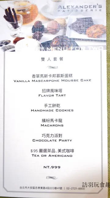 ❤️ Alexander's 母親節限定版 ❤️ 巧克力慕斯蛋糕 NT $1,280 元 好漂亮的蛋糕喲!美到讓人一直盯著它看呢!! 輕盈寶寶超想買的 可是爸爸媽媽都不愛太甜的蛋糕 Alexander's 位於台北市忠孝東路四段223巷41號 每次經過輕盈寶寶都好想進來看看呢! 最美的相遇,就是和你漫步 ,午後微甜的午茶小品,你的在乎是我最大的滿足!看到這~ 輕盈寶寶決定要進去了! Alex 的生意滿好的! 本來以為裡面應該都是看到甜點會尖叫的女孩他們都是吃完飯之後過來喝晚茶的客人 這個半圓的沙發座椅超夢幻的那個誰誰誰 ???下次下午茶吃這間好嗎? 雙人套餐的 Menu ❤️ 超愛巧克力的輕盈寶寶看到巧克力派對眼睛為之一亮口水都快流出來了! 輕盈寶寶一眼就決定要這個巧克力塔 什麼?!已經被剛剛的客人點走了哭哭 @@如果看到廚櫃裡只剩一個記得要趕快跟服務人員說!我要..我要... 所以輕盈寶寶這次就吃這個囉!焦糖塔 NT 200 元 巧克力球也超繽紛的 買了2顆巧克力球 萊姆酒 NT 90 + 檸檬起司蛋糕 NT 90 Alex 還有賣鳳梨酥一個 NT 38 元 哇~~~ 松露巧克力禮盒也太吸引人了! 都是這個馬卡龍聖誕樹太可愛了啦!輕盈寶寶站在門外看著它尖叫然後就貼著人家的玻璃那樣 驚喜蛋 NT 299 元 ~ 輕盈寶寶下次想吃你 聽說 Alex 的馬卡龍也狠厲害 輕盈寶寶選了 2 顆櫻花抹茶 + 薰衣草起司 最後又點了一杯熱伯爵茶來搭配這些甜點不只甜點好吃不會太甜! 這樣比較不會有罪惡感!連伯爵茶都好香濃啊! 輕盈寶寶FB粉絲專頁https://www.facebook.com/princessyabe