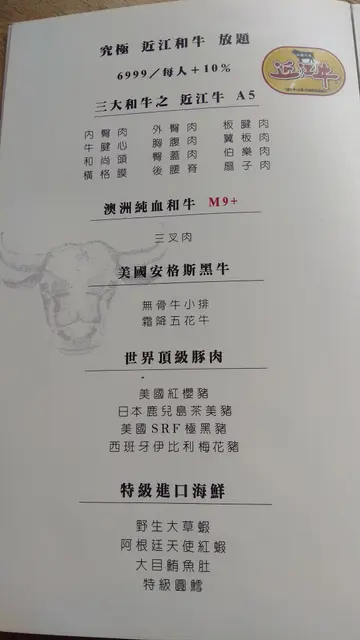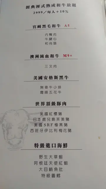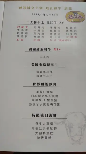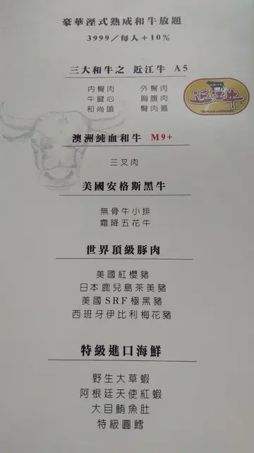 日本a5 和牛 / 生級 蝦 / 生蠔 / 肉 鮮品 菜拉 / 法式和牛滷肉飯 / 法式和牛澄清湯 / 近江牛 / 帝王蟹吃到飽 / 炸牡蠣 / 香草焦糖布丁 / 特選冰淇淋 / 黑虎蝦 / 義式和牛羅宋湯
